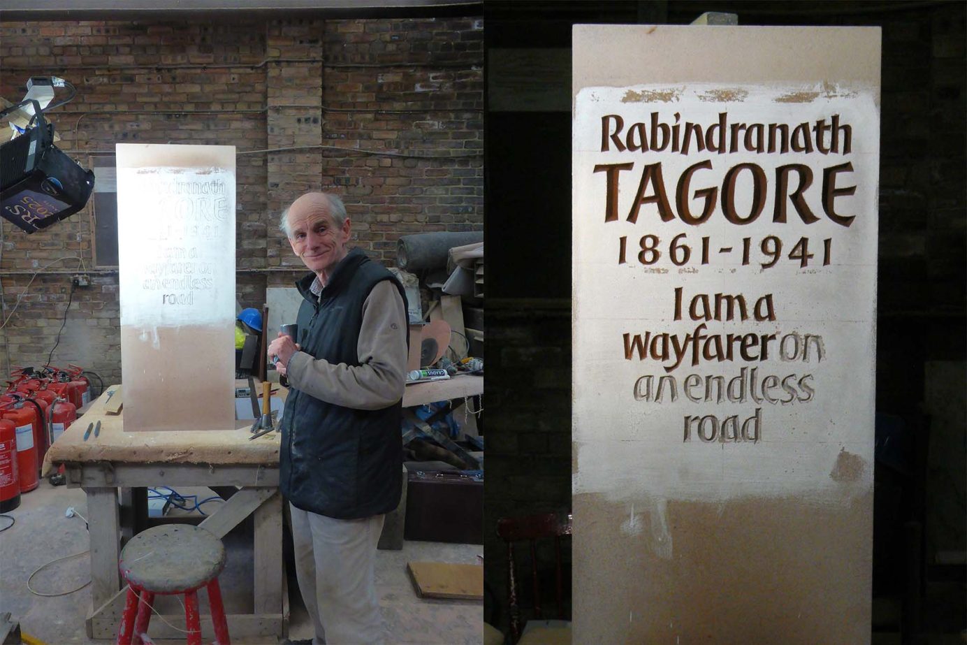 The epitaph on a base of Doddington stone carved by John Neilson for a bronze bust of Rabindranath Tagore.